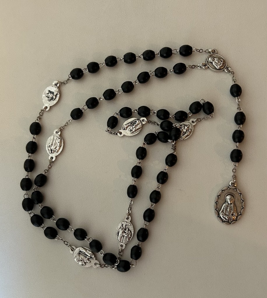 This rosary consists of seven sets of seven beads. There are seven mysteries representing moments of Sorrow experienced by our Sorrowful Mother. Many variations are introduced online, with some being more extensive than others. We pray the Lord’s prayer on the big beads and Hail Mary on the small beads. Here is a quick example of how I pray, but please feel free to make adjustment whatever applies to your life now: